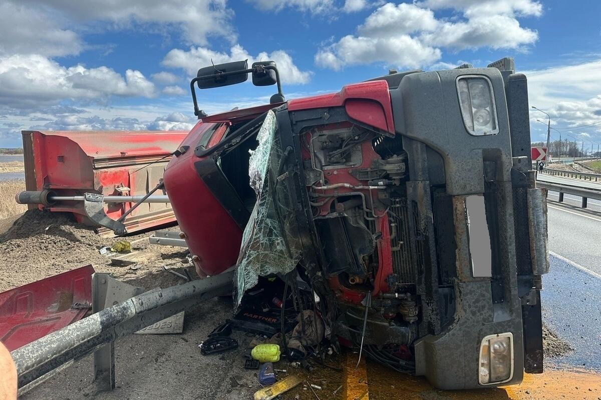 Все случилось около 13:30 16 апреля на 128-м километре трассы М-10 в Конаковском районе. Водитель не выбрал безопасную скорость при повороте, в результате чего наехал на ограждение, после чего большегруз завалился набок. Водитель получил травмы.