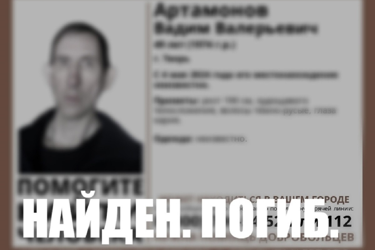 Пропавшего в Твери Вадима Артамонова обнаружили погибшим. Об этом сообщает поисковый отряд «ЛизаАлерт» Тверской области.