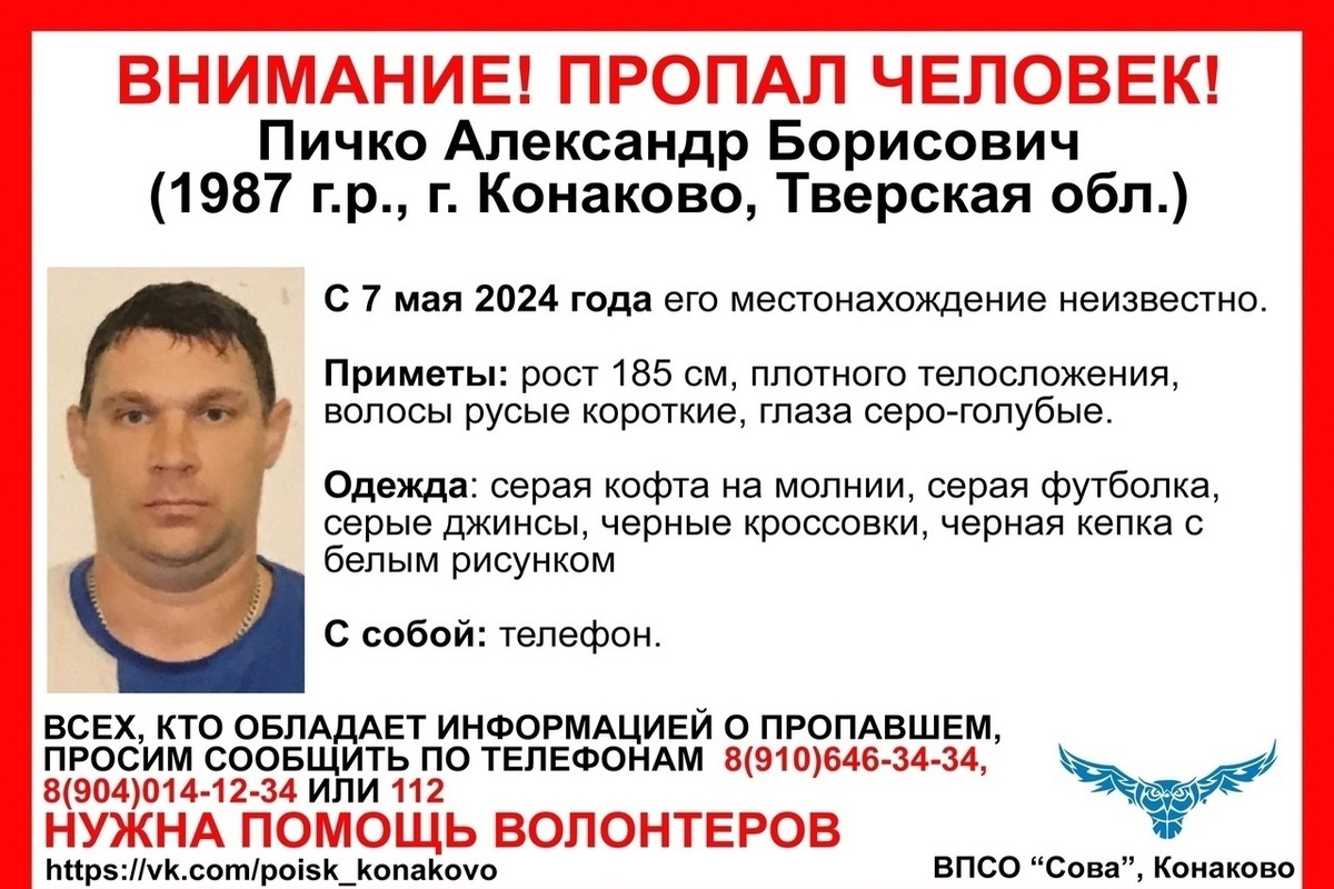 Волонтеры тверского поисково-спасательного отряда "Сова" объявили новый поиск – пропал Александр Борисович Пичко 1987 года рождения из Конаково Тверской области.