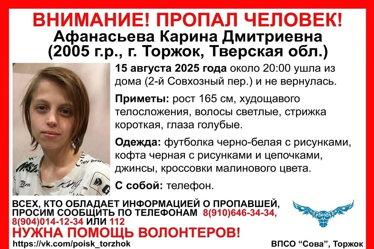 В городе Торжке Тверской области пропала Карина Дмитриевна Афанасьева 2005 года рождения, сообщают волонтеры тверского спасательного отряда "Сова".