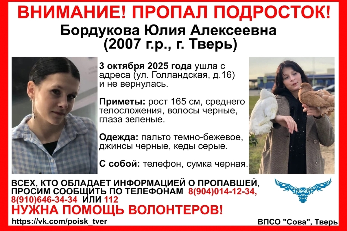 С 3 октября неизвестно местонахождение несовершеннолетней жительницы Твери Бордуковой Юлии Алексеевны, сообщает ВПСО “Сова”.