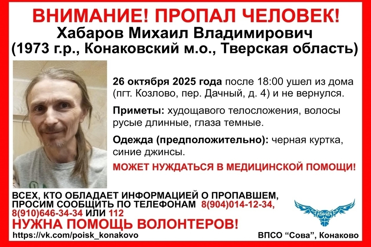 В Тверской области начались поиски жителя Конаковского округа Хабарова Михаила Владимировича, сообщает ВПСО “Сова”.