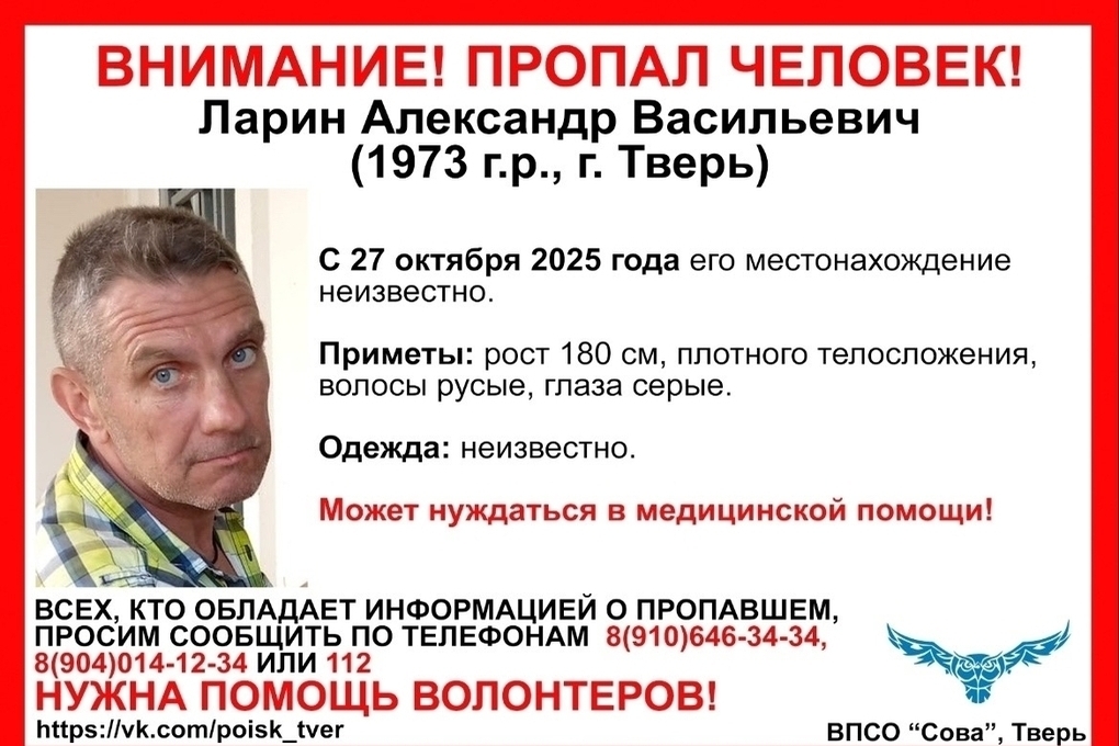 С 27 октября неизвестно местонахождение жителя Твери Ларина Александра Васильевича, сообщает ВПСО “Сова”.