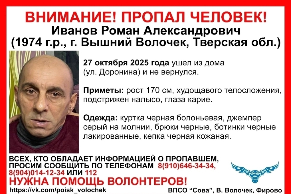 Члены поискового отряда “Сова” опубликовали еще одну ориентировку - пропал житель Вышнего Волочка Тверской области Иванов Роман Александрович.