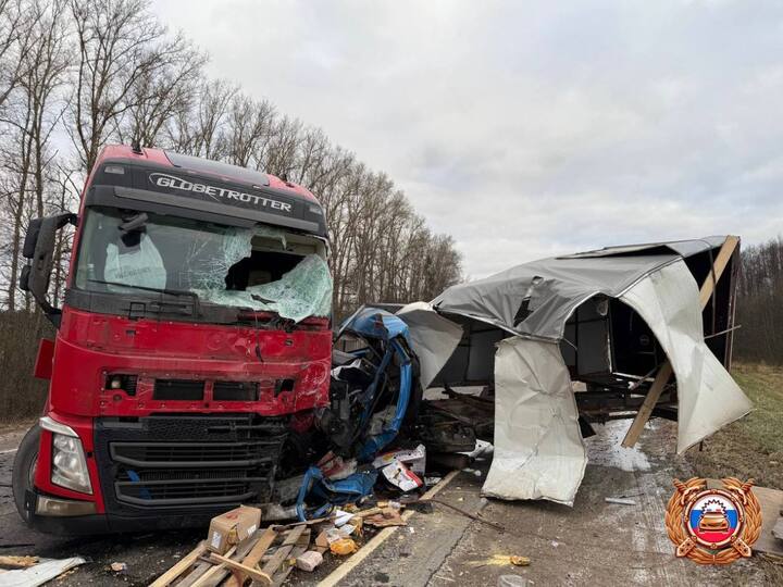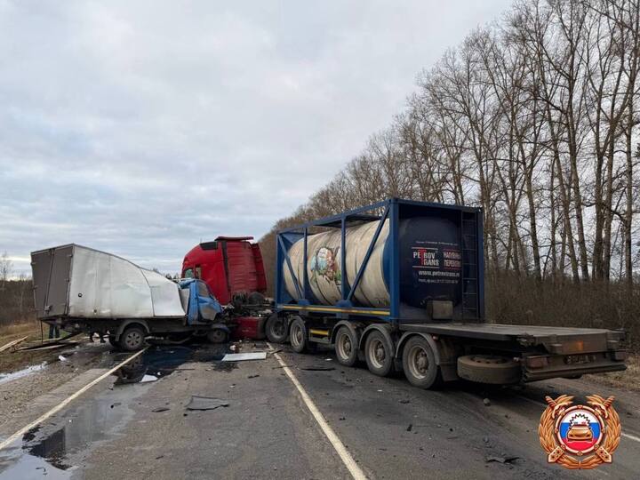 В МЧС России сообщили, что на дороге столкнулись два грузовика. По предварительны данным Госавтоинспекции, водитель "Газели" выехал на встречную полосу, где врезался в фуру "Вольво". На месте работают спасатели, которые ликвидируют последствия ДТП.