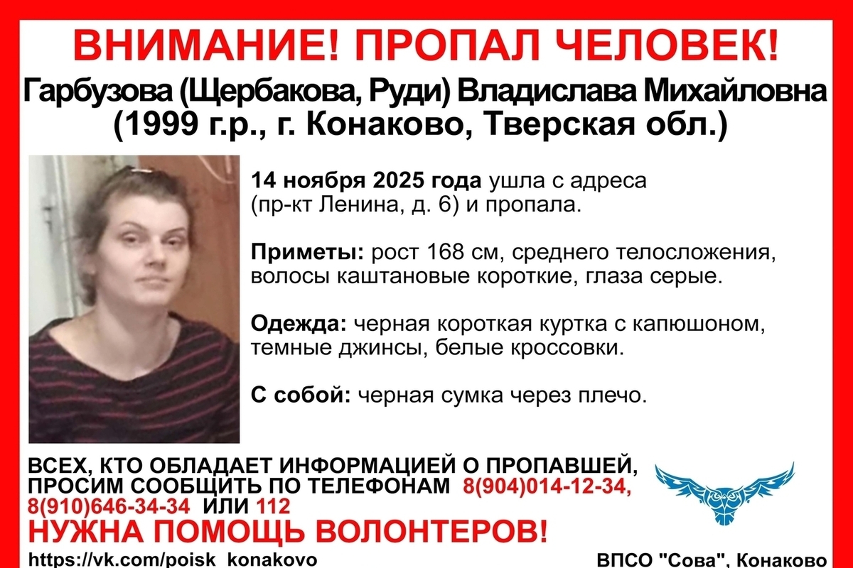 В Тверской области начались поиски жительницы Конаково Гарбузовой Владиславы Михайловны, сообщает ВПСО “Сова”.