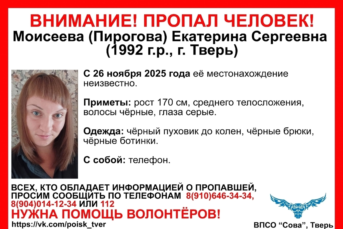 ВПСО "Сова" города Тверь сообщает о пропаже Екатерины Сергеевны Моисеевой (Пироговой).
