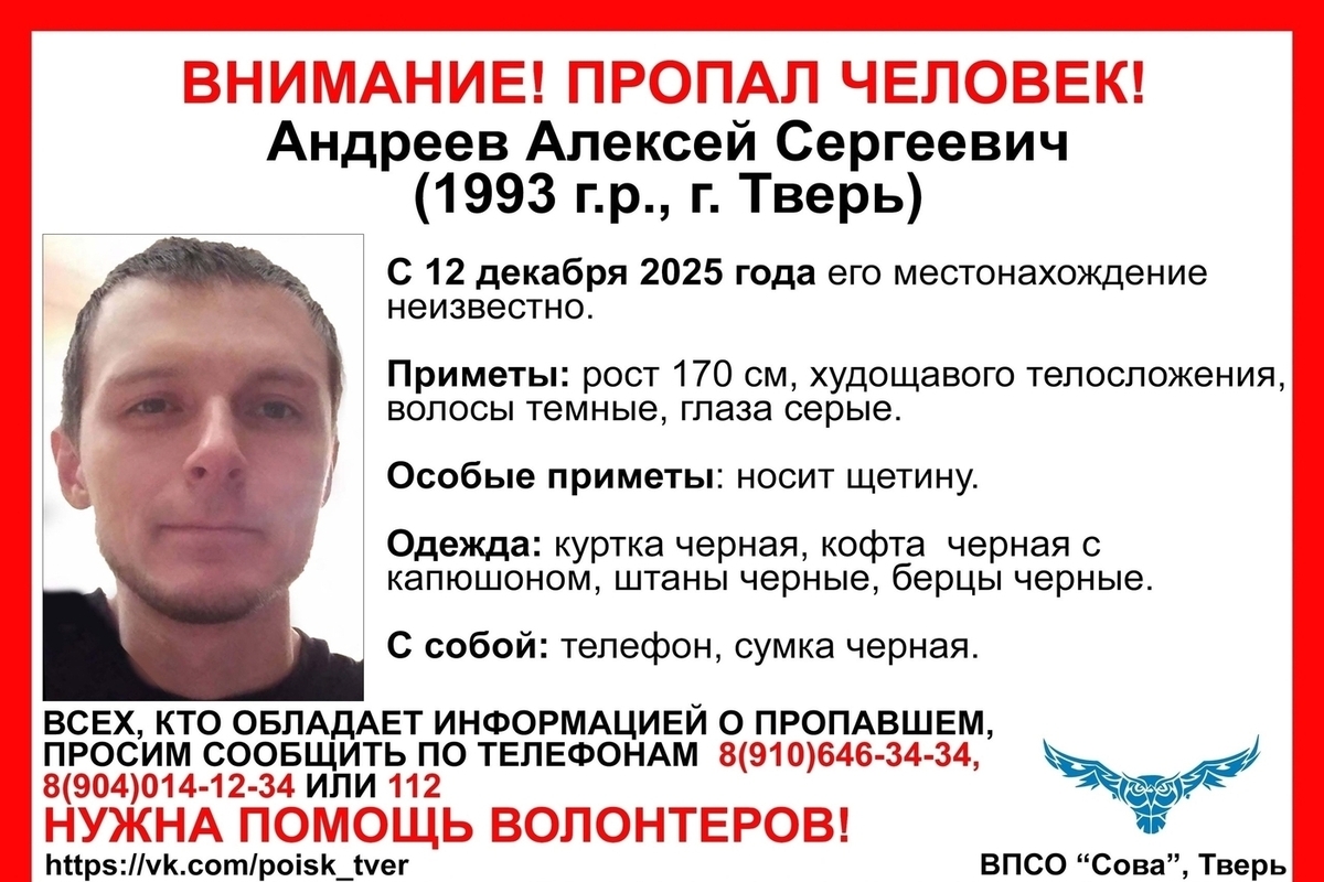 ВПСО “Сова” объявил о начале поисков жителя Твери Андреева Алексея Сергеевича.