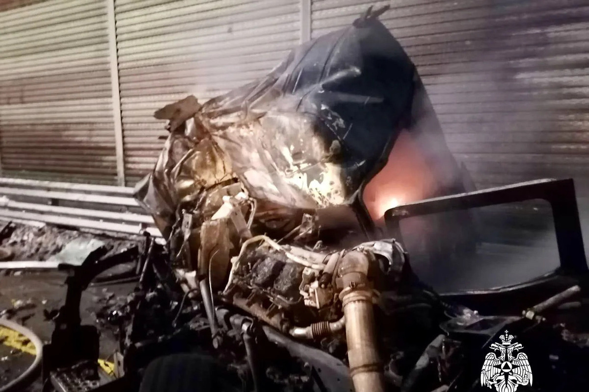 По данным экстренного ведомства, на указанном участке дороги столкнулись два грузовых автомобиля, один из которых загорелся.