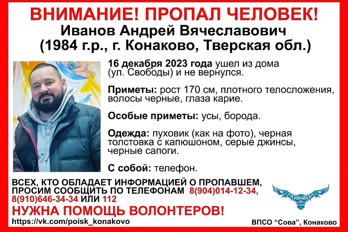 В Конаково Тверской области пропал Андрей Вячеславович Иванов. Об этом сообщают волонтеры ВПСО «Сова».