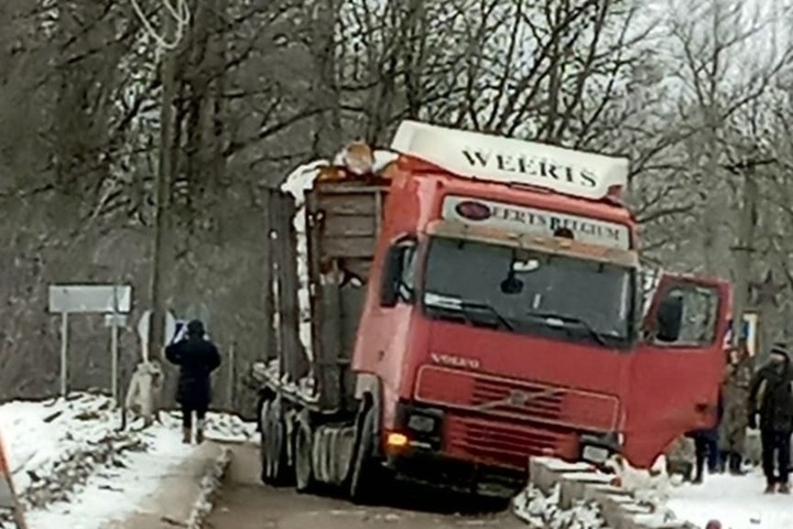 Груженый бревнами многотонный грузовик пытался проехать по мосту в поселке Красномайский, но попытка оказалась безуспешной. Передние колеса автомобиля попали в дыру сооружения и движение оказалось перекрыто.