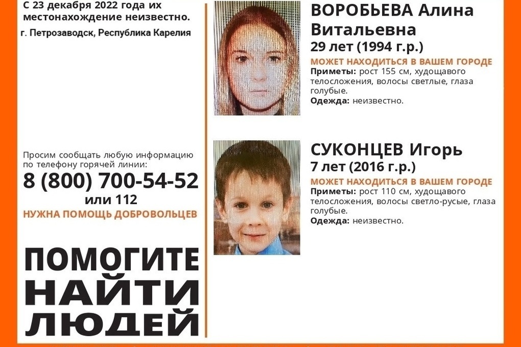 Как сообщает "ЛизаАлерт", о местонахождении 29-летней женщины и 7-летнего мальчика ничего не известно с 23 декабря 2022 года.