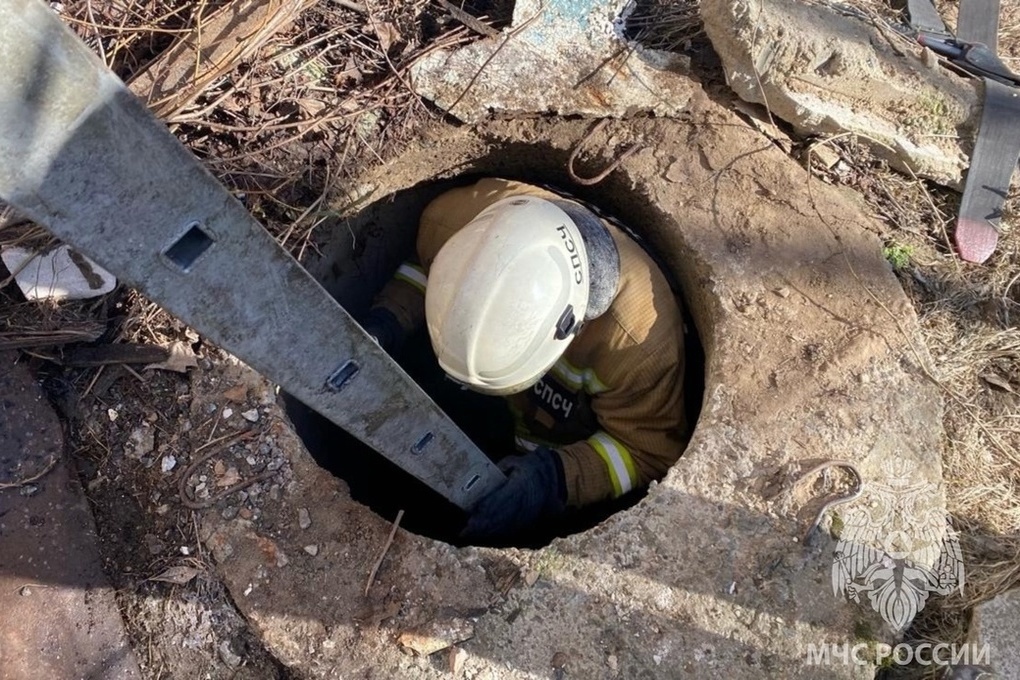 По неизвестной причине пёс провалился в колодезный люк, откуда сам выбраться конечно не смог. На место были вызваны спасатели, которые достали животное из западни и передали хозяину.