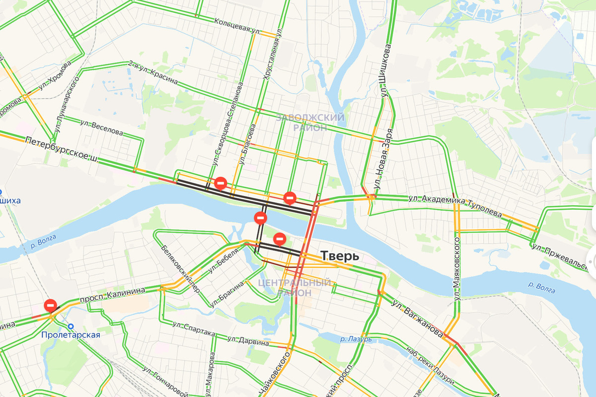 Центр Твери днем в воскресенье, 19 мая, встал в большую пробку. Это подтверждают данные "Яндекс карт", согласно которым мосты через Волгу и центральные улицы окрасились красным цветом.