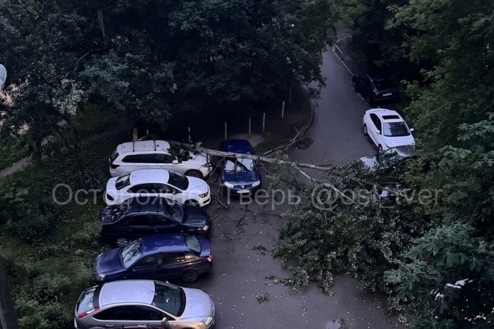 Во дворе на улице Левитана в Твери упало дерево. Пострадало несколько машин.