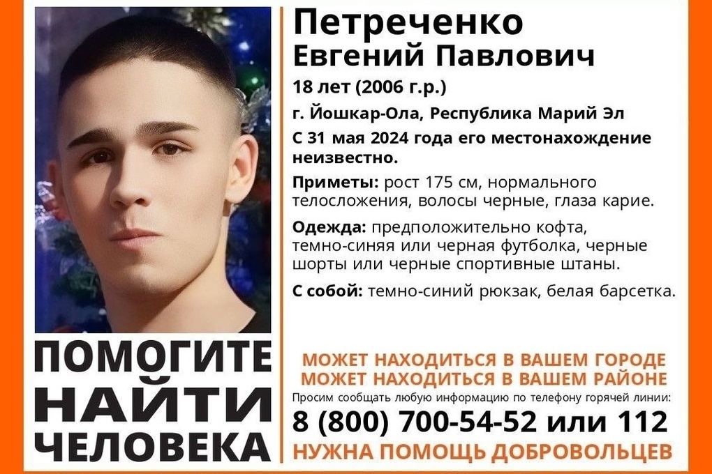 Местонахождение 18-летнего Евгения Петреченко из города Йошкар-Ола неизвестно с 31 мая 2024. Приметы, по которым можно узнать молодого человека, указаны в ориентировке.