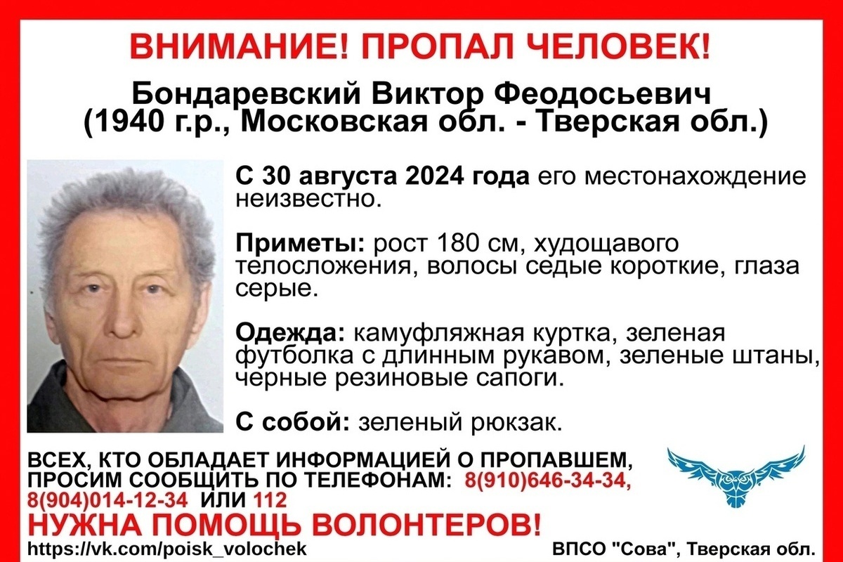 В Тверской области может находиться Виктор Бондаревский, сообщили волонтеры поискового отряда «Сова» 2 сентября.