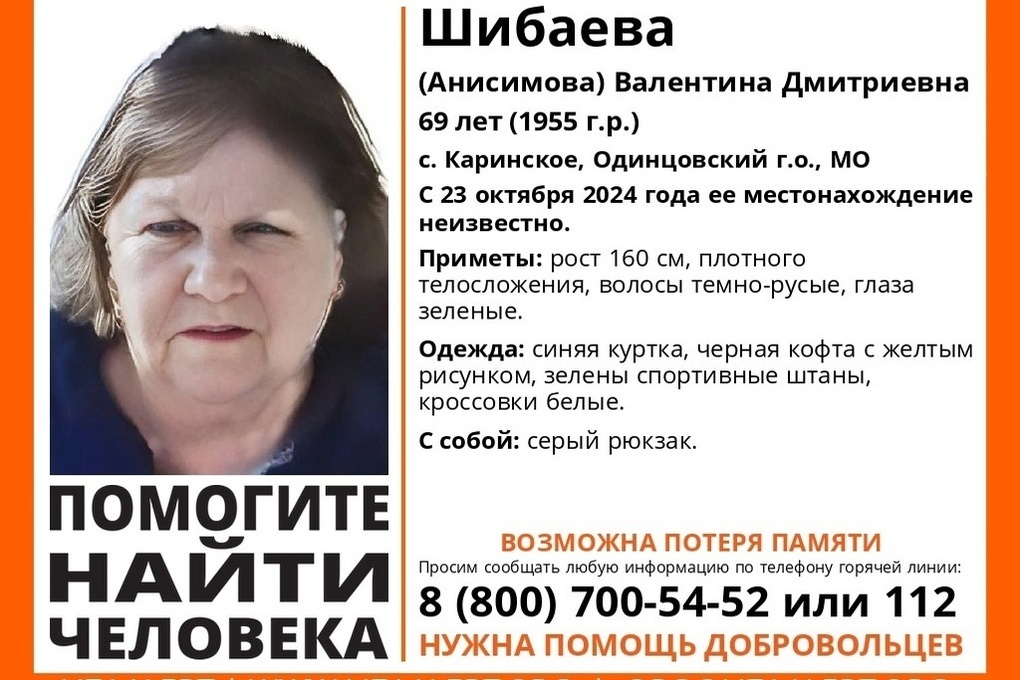 69-летняя женщина пропала 23 октября в селе Каринское Одинцовского городского округа. С того дня информации о ее местонахождении нет. Отмечается, что у женщины возможно потеря памяти.