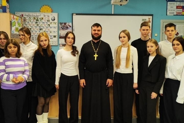 К школьникам в гости пришел выпускник этого учебного заведения, ныне иерей одного из костромских храмов Дмитрий Трифонов.