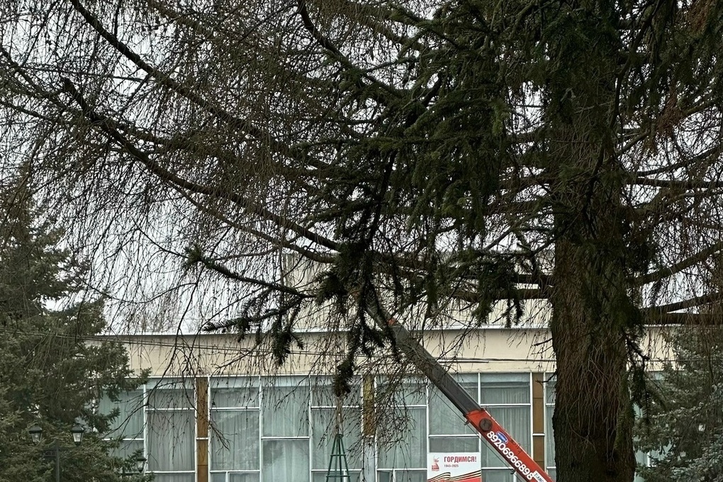 В городе Лихославль Тверской области началась установка главной новогодней елки. Искусственную ель начали монтировать на площадке перед районным Домом культуры.