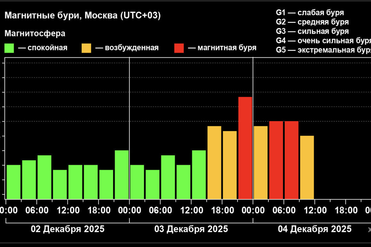 По данным специалистов, геомагнитный индекс в первой половине четверга достигает отметки в 4-5 баллов. Активность магнитосферы находится на уровне G1 (слабая магнитная буря). При этом в ночь с 3 на 4 декабря геомагнитный индекс достигал отметки в 6-7 баллов, что соответствует уровню G3 (сильная буря). Такие показатели превысили ожидания ученых. Они прогнозировали магнитную бурю класса G2 (средняя буря).
