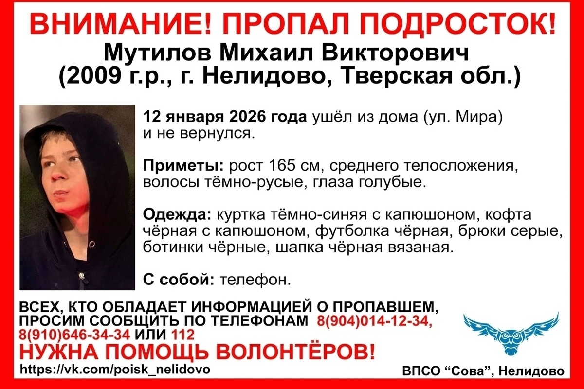 В Тверской области в Нелидово ищут Мутилова Михаила Викторовича 2009 года рождения, сообщает ВПСО «Сова».